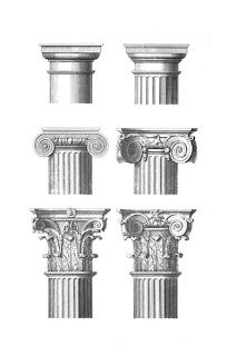Колонна разделяется на фуст (ствол колонны) и капитель. Фуст состоит из барабанов и украшен каннелюрами (вертикальные углубления, проходящие через весь ствол колонны). Канелюры дорического ордера не глубокие и примыкают друг к другу образуя острые грани, их количество состовляет от 16 до 20 штук. Капитель состоит из двух частей - эхина (круглая подушка криволинейного профиля) и квадратной аббаки. Фуст и капитель разделены между собой горизонтальными врезами: в греко-дорическом ордере бороздкой, а в римско-дорическом - выпуклым профиль-ремешоком, гипотрахелий и между ними находится промежуток, как бы продолжение фуста, который называется шейкой. На колонны устанавливался антамблемент.
